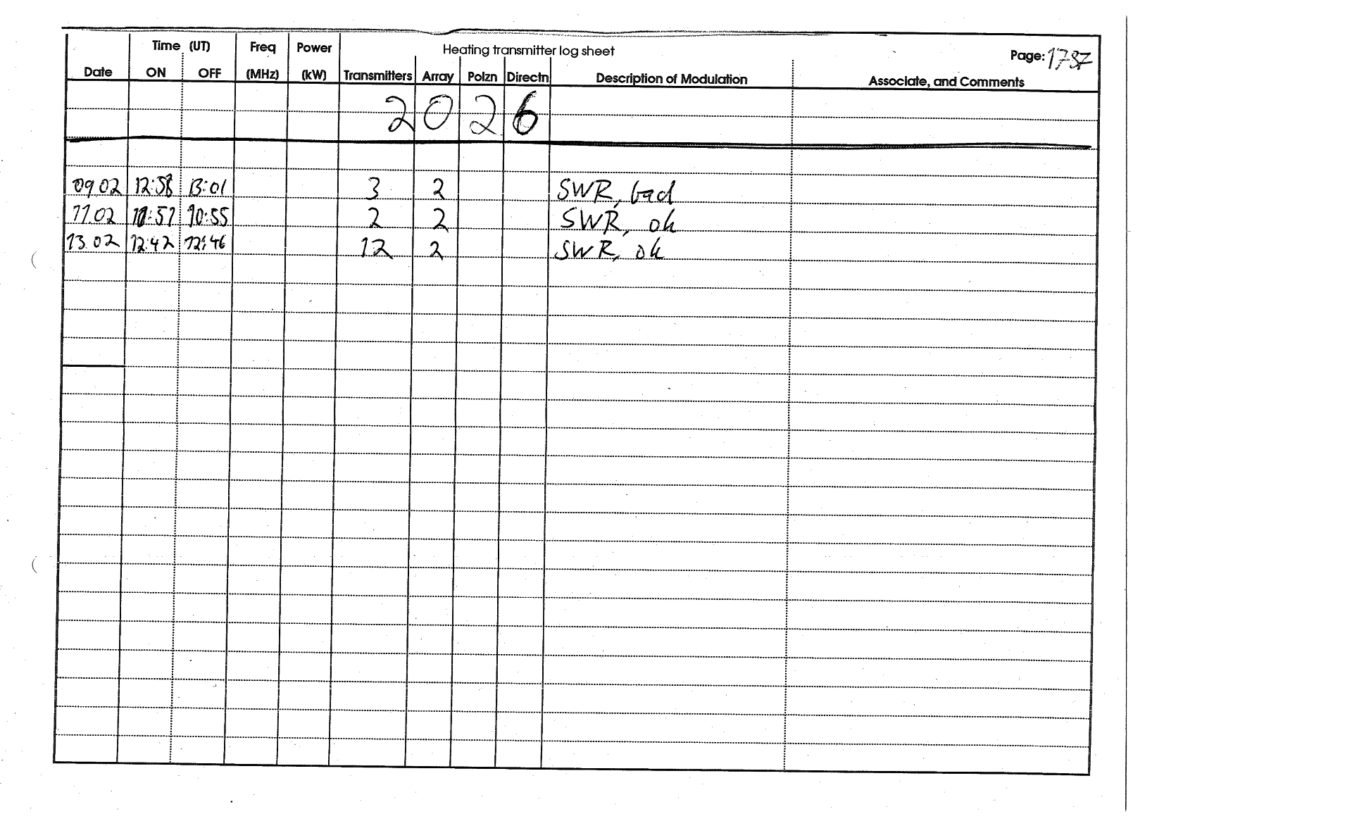 | February 2026 | 9 February 2026 | p1787 | EROS-tx-log | SWR test. | 11 February 2026 | p1787 | EROS-tx-log | SWR test. | 13 February 2026 | p1787 | EROS-tx-log | SWR test. |
